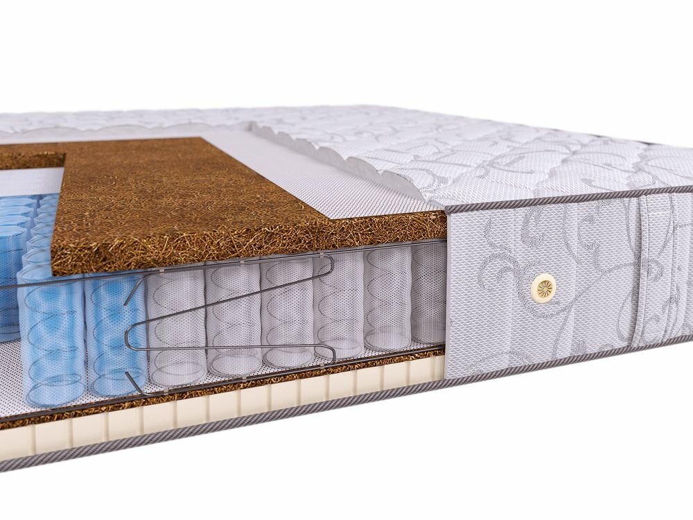 Лучшие цены. Пружинный матрас Hit Vario TFK + разносторонней жесткости выполнен из натуральных материалов: латексированной кокосовой койры и натурального латекса на независимом 5-ти зональном пружинном блоке «Покет 5 зон» (256 пр/м2) с усилением по периметру Z пружинами, который равномерно распределяется нагрузку тела и создает правильную поддержку позвоночника во время сна. Матрас выполнен методом пристрелки без применения клея. Магазины в вашем городе.