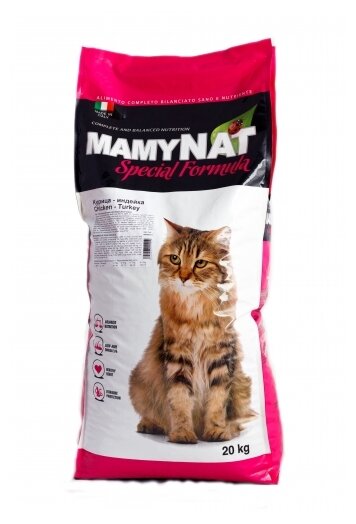 Лучшие цены. MamyNAT Cat Adult Chiken-Turkey. Сухой корм для взрослых кошек. Состав: обезвоженное мясо (35% из которого курица и индейка 16%, 19 % смесь говядины и свинины), кукуруза, пшеница, куриный жир, рыбная мука (3%), мякоть сушеной свеклы (2%), минеральные вещества. Пищевые добавки на 1 кг корма: 3a672a витамин A 18000 UI, E671 витамин D3 1200 UI, 3a700 витамин E (t. r. alpha toc. Магазины в вашем городе.