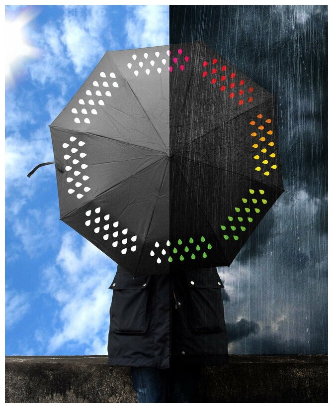 Лучшие цены. Когда небо затянуто хмурыми тучами, тяжело оставаться в хорошем настроении, но этот складной зонт поможет вам смотреть на вещи позитивно! Принты в виде капель сделаны из специальной краски, меняющей свой цвет под воздействием воды. Так что не удивляйтесь, когда под дождём ваш чёрно-белый зонт вдруг оживёт и заиграет всеми цветами радуги. Настоящее волшебство! Механический зонт не только защитит от дождя, но и станет прекрасным дополнением к вашему образу. Магазины в вашем городе.