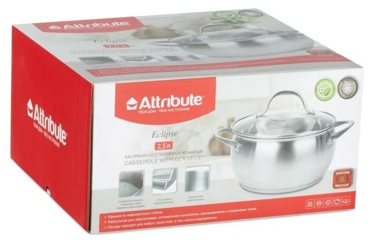 Кастрюля attribute eclipse 2,5л 18см нерж.сталь стеклянная крышка индукция