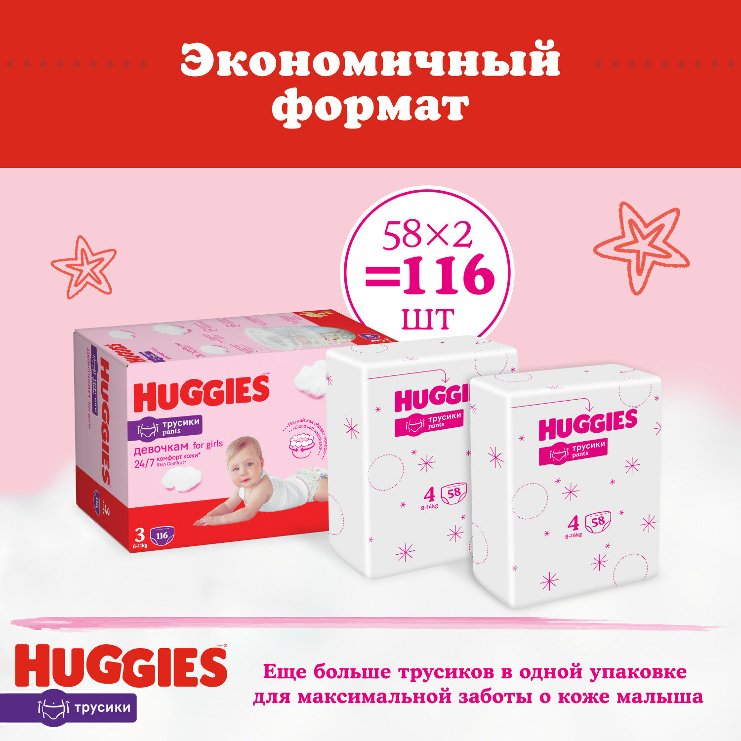 Huggies трусики для девочек 3, 6-11 кг, 58 шт., 58 шт., 3, 6 - 11 кг