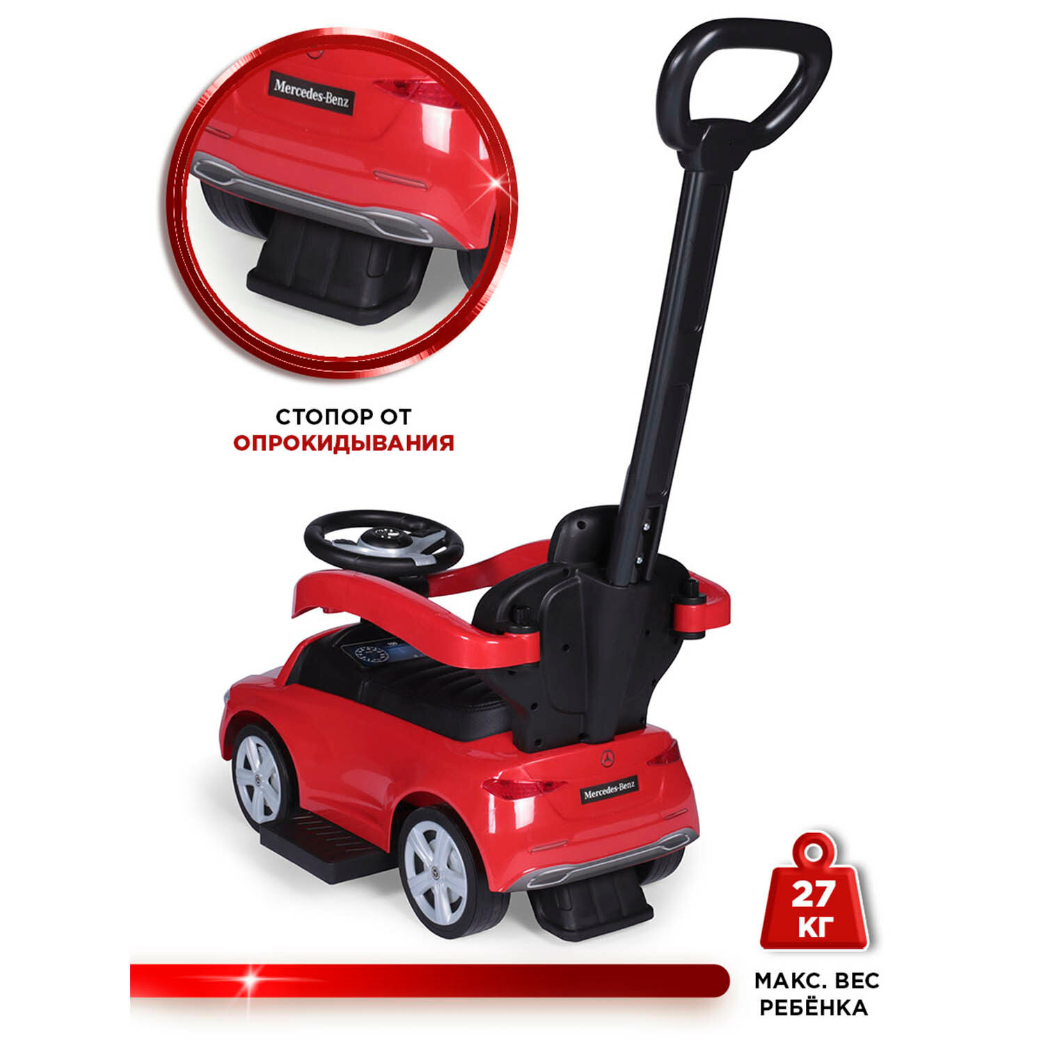| Оснащение | спинка / родительская ручка (с подстаканником) / подставка для ног / защитный бампер / упоры от переворачивания / багажник / клаксон / звуковые эффекты |
