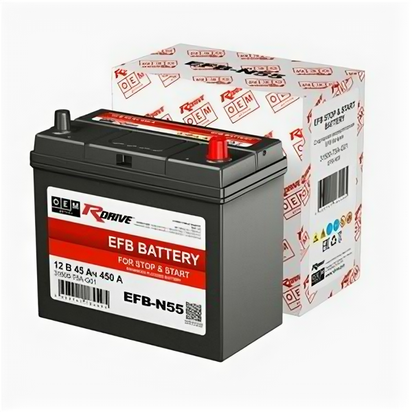 Лучшие цены. Аккумулятор автомобильный RDrive EFB Start-Stop N55 31500-T5A-G01 45 Ач 450А (B24L). Габариты 237x127x225. Производство Китай. Гарантия 24 месяца. Магазины в вашем городе.