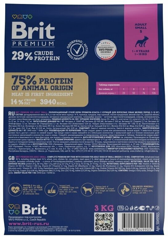 Брит Premium Dog Adult Small 5049905 с курицей д/взрослых собак мелких пород (110 кг), 3кг .