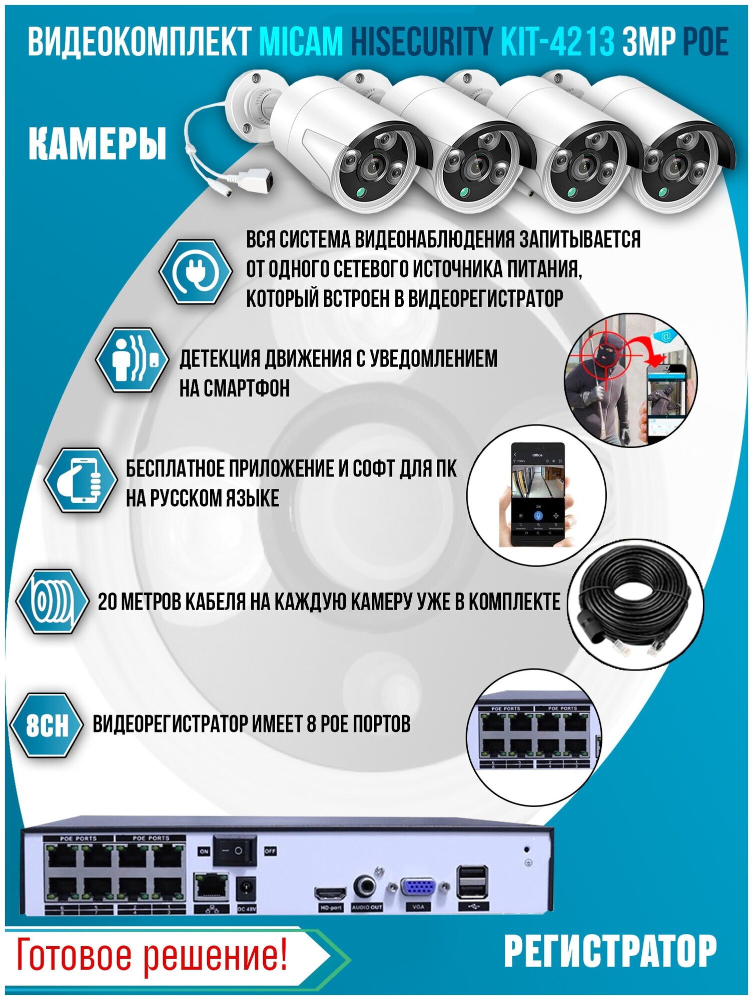 Лучшие цены. Купить цифровой IP POE комплект видеонаблюдения на 4 камеры со звуком MiCam HiSecurity KIT-4213 можно для самостоятельной установки на дачном участке или любой открытой территории. Все камеры рассчитаны на внешнюю установку, поэтому будут прекрасно работать и в помещении. Особенности комплекта видеонаблюдения MICAM KIT-4213 Для установки не требуются специальные навыки. Достаточно определиться с местом установки видеорегистратора, установить камеры и подключить кабеля. Магазины в вашем городе.