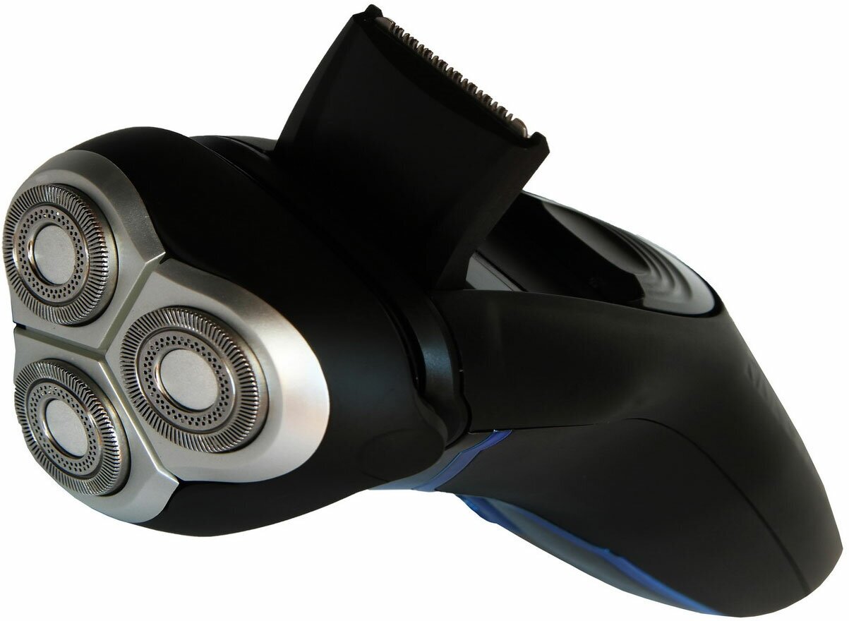 Лучшие цены. Корпус модели сделан из ударопрочного пластика черного цвета с покрытием SOFT TOUCH для удобного удерживания в руке. Глянцевые чёрные и синие вставки добавляют изделию стиля и солидности. Механизм бритвенного блока двигается в двух плоскостях, а три головки бритвенного блока плавающие, для повторения контуров лица, комфортного бритья. Состоит из трех плавающих самозатачивающихся бритвенных головок. Материал головок и лезвий нержавеющая сталь. Магазины в вашем городе.