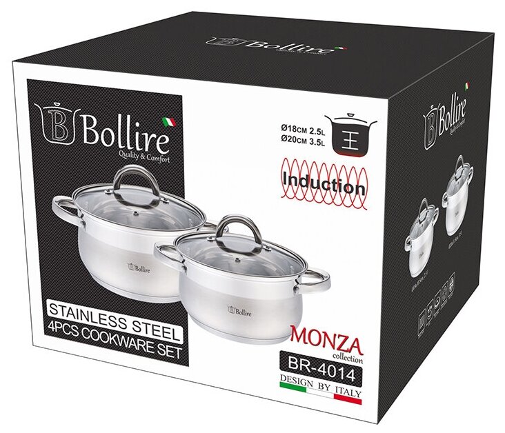 Лучшие цены. В набор кастрюль Bollire MONZA BR-4014 входит: - Кастрюля 2.5л 18x10.5см с крышкой; - Кастрюля 3.5л 20x11.5см с крышкой; Материал: нержавеющая сталь; Тип: набор кастрюль; Внутреннее покрытие: зеркальная полировка, внутренняя отметка литража; Внешнее покрытие: сатинированная полировка 2/3 корпуса, зеркальная полировка 1/3 корпуса; Технология дна: 5-ти слойное капсульное дно (0.5 мм алюминия, 1.5 мм железа, 0.5 мм алюминия). Магазины в вашем городе.