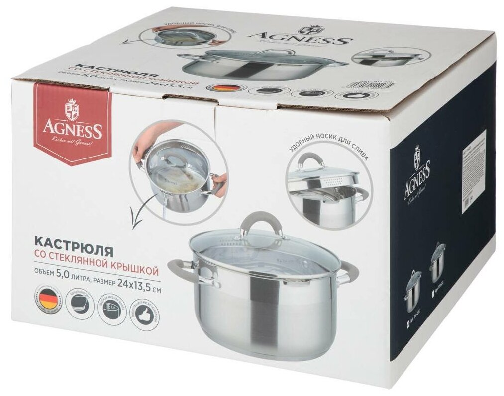 Лучшие цены. Кастрюля profi home со стеклянной крышкой, 5,0л 24x13.5 см Agness (914-218) Бренд AGNESS представляет стильные кастрюли серии PROFI HOME. Кастрюли выполнены из нержавеющей стали с высокими антикоррозионными свойствами. Преимущества серии PROFI HOME это: • Практичный дизайн с широким носиком для слива, что очень удобно во время готовки • Энергосберегающее капсульное дно. Такое дно имеет свойства накапливать (аккумулировать). Магазины в вашем городе.