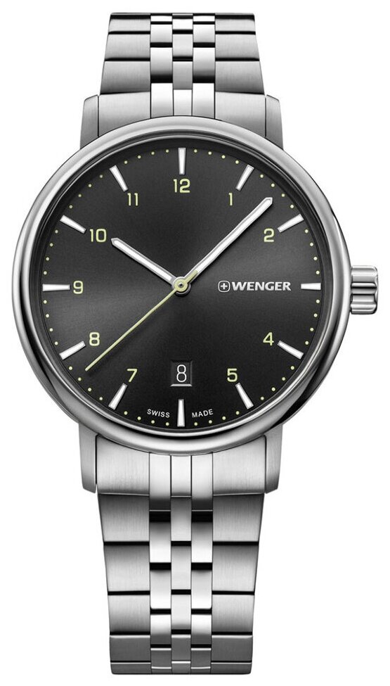 Лучшие цены. Швейцарские наручные часы Wenger 01.1731.120. Коллекция Urban Classic. Мужские. Корпус и браслет из нержавеющей стали, циферблат чёрный. Диаметр корпуса 40 мм. Браслет с раскладывающейся застежкой. Окошко даты. Минеральное стекло с сапфировым покрытием. Рифленая заводная головка. Водозащита 100м (10 АТМ). Гарантия 3 года. Wenger – известная швейцарская компания, производитель часов и товаров для путешествий, отметившая своё 125-летие в 2018 году. Магазины в вашем городе.