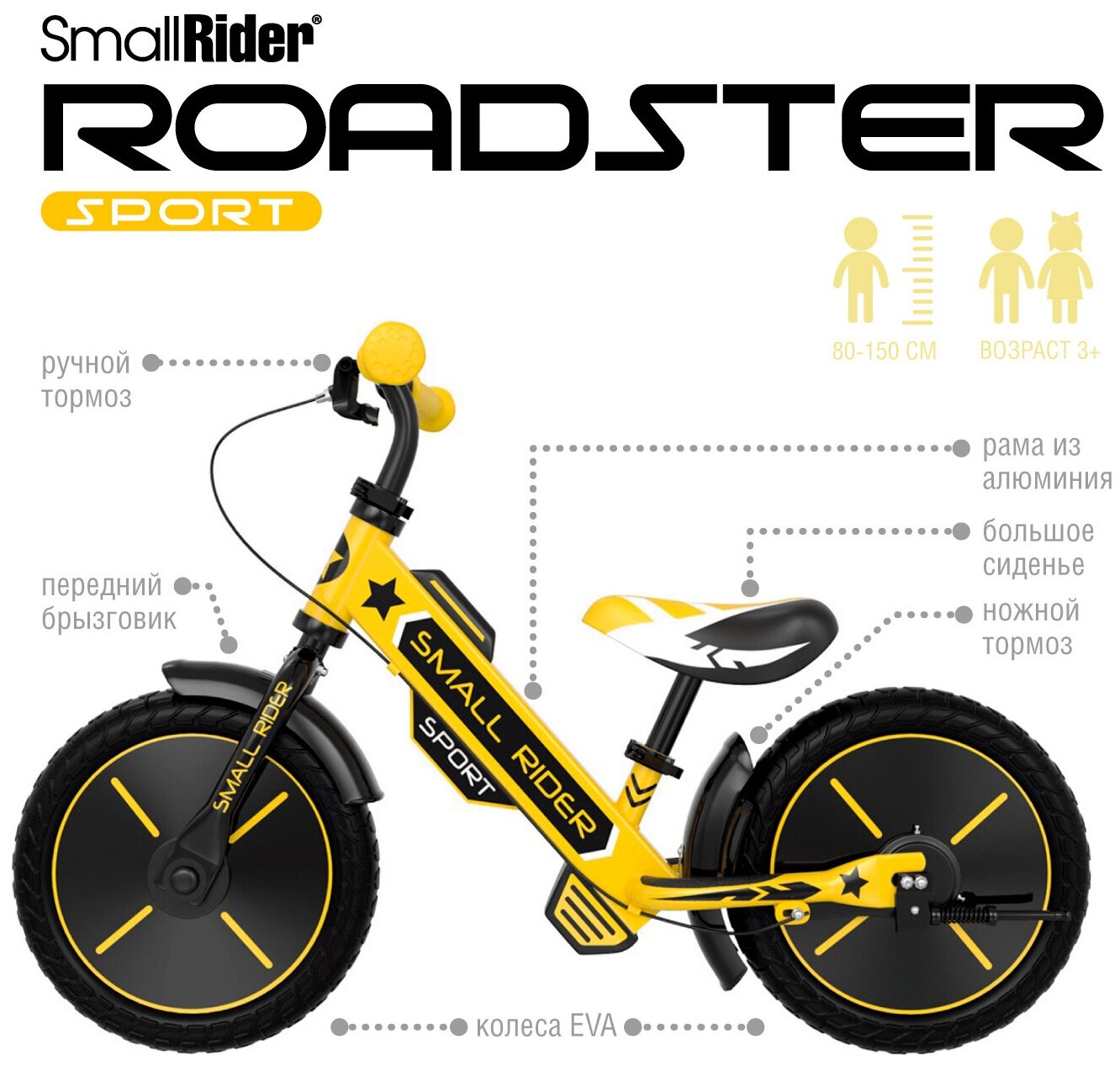 Лучшие цены. \'Роадстер Спорт\' - это самая известная и премиальная линейка популярного бренда \'Small Rider\'. В 5-м поколении беговела дизайн стал еще более фантастическим и впечатляющим. Рама выполнена из алюминиевого сплава с инновационным квадратным профилем и мягкими зрелищным накладками. Руль имеет изогнутую форму и легко управляется при помощи подшипников. У беговела есть целых два тормоза! Ручной тормоз имеет плоский курок, который удобно выжимать детской рукой, а ножной тормоз интегрирован в задний брызговик. Магазины в вашем городе.