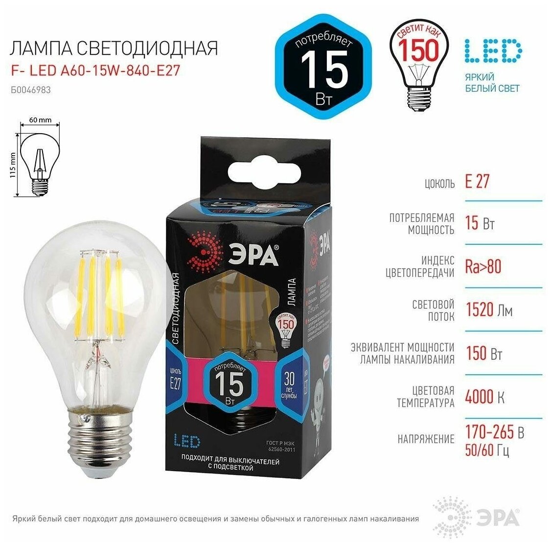 Лампочки Лампа светодиодная филаментная F-LED-15W-840-E27 15Вт A60 грушевидная 4000К нейтр. бел. E27 Эра ЭРА Б0046983 (1 шт.)