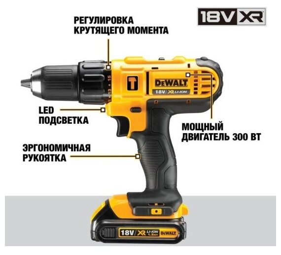 Лучшие цены. Удобная и эргономичная ударная дрель-шуруповерт для работы по дереву, металлу и бетону. Мощная 18,0 В компактная дрель-шуруповерт последнего поколения с новыми уникальными аккумуляторами технологии XR Li-ion ёмкостью 4 Ач. Компактный 13 мм одномуфтовый быстрозажимной патрон с автоматической блокировкой шпинделя для быстрой смены насадок одной рукой. 2-х скоростной полностью металлический редуктор с планетарной передачей. Магазины в вашем городе.