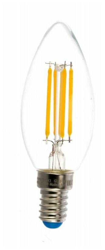 Лучшие цены. Лампа светодиодная филаментная LED-C35-6W/WW/E14/CL GLA01TR из серии «AIR C» от производителя Uniel (Китай). Цвет товара серый. Используемые материалы: металл. Цоколь E14. Вид ламп: светодиодная. Изделие выполнено в форме «свеча». Мощность одной лампы составляет 6 Вт. Напряжение 220-240 Вольт. Поток света 610 Люмен. Заявленный производителем срок работы 30000 часов. Расширенная гарантия на товар 2,5 года. Высота 100 мм. Диаметр 35 мм. Вес товара 0.025 кг. Комплектация: Лампа светодиодная филаментная. Магазины в вашем городе.