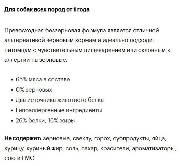 Лучшие цены. Для собак всех пород с 12 месяцев. Натуральный гипоаллергенный беззерновой корм на основе диетического мяса утки и индейки идеально сбалансирован для собак с чувствительным пищеварением или склонных к аллергии. Содержит простые и легкоусваиваемые полезные ингредиенты, имеет превосходный и натуральный вкус без добавления искусственных ароматизаторов. Тщательный отбор ингредиентов предотвращает аллергические реакции и пищевую непереносимость, обеспечивает отличное физическое состояние и долгую здоровую жизнь. Магазины в вашем городе.
