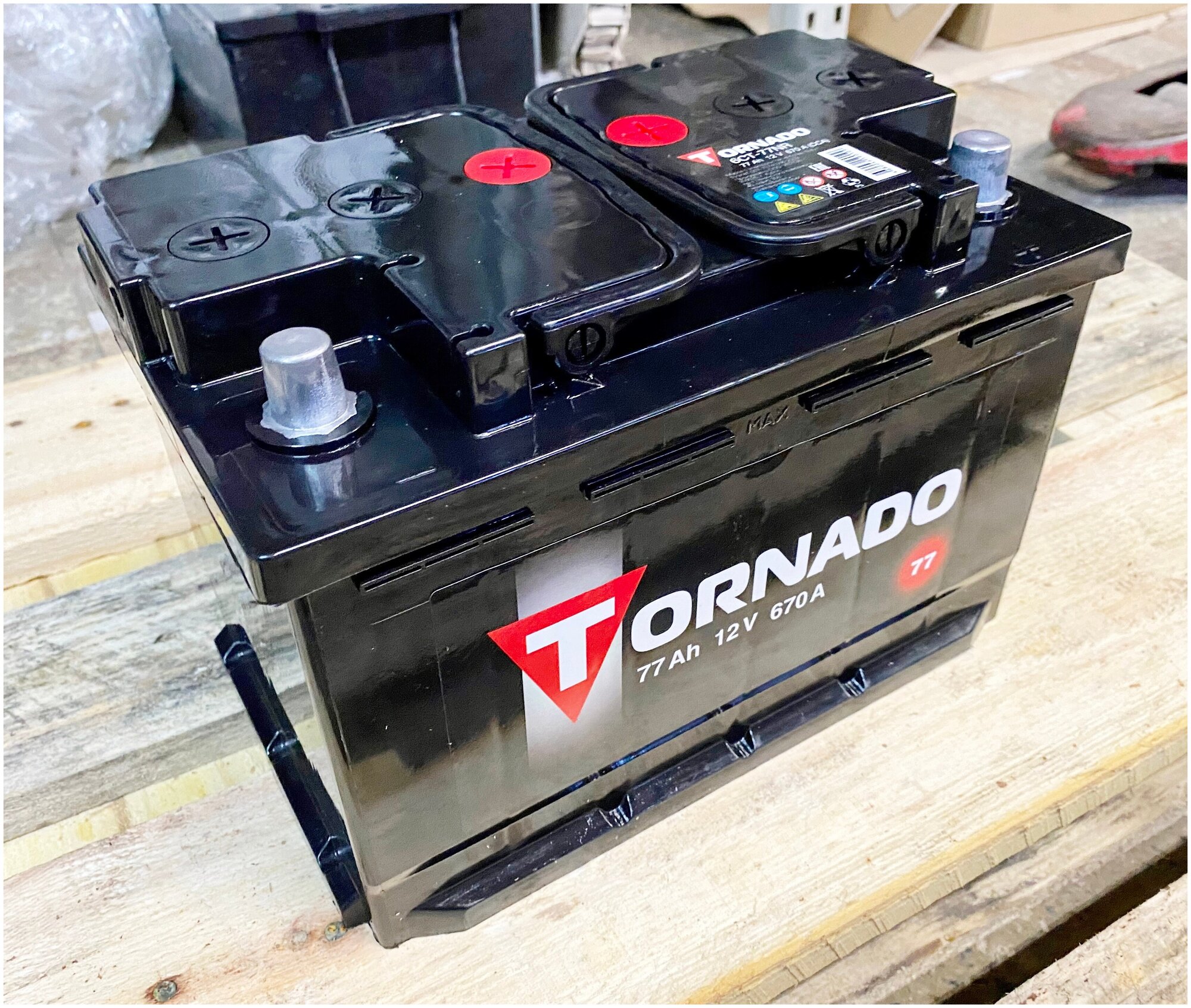 Лучшие цены. Автомобильный аккумулятор Tornado 77 Ач, обратная полярность (плюс справа), пусковой ток 670А - не дорогой и качественный продукт, который производит по современной технологии (Ca+) Курский аккумуляторный завод. Аккумулятор для автомобиля Tornado 77 ач надежный и экономичный вариант со сроком службы от 3-х лет. При покупке автомобильного аккумулятора Tornado 77 ач, мы дарим специальную Защитную Смазку для клемм аккумулятора. Магазины в вашем городе.