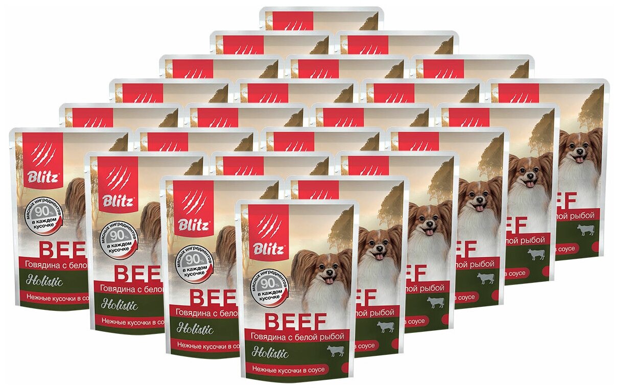 Корм для собак BLITZ DOG Holistic BEEF говядина/белая рыба, для собак мелких пород, кусочки в соусе, 24 шт. по 85 гр.