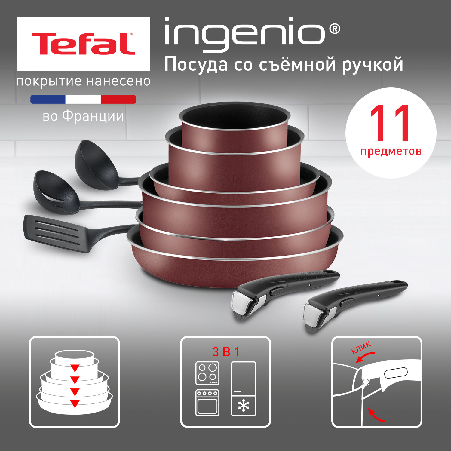 Кастрюля Набор посуды со съемной ручкой Tefal Ingenio RED 5 04186850, диаметр 16/20/22/26/28 см, 11 предметов, с индикатором температуры и антипригарным покрытием, для газовых, электрических плит