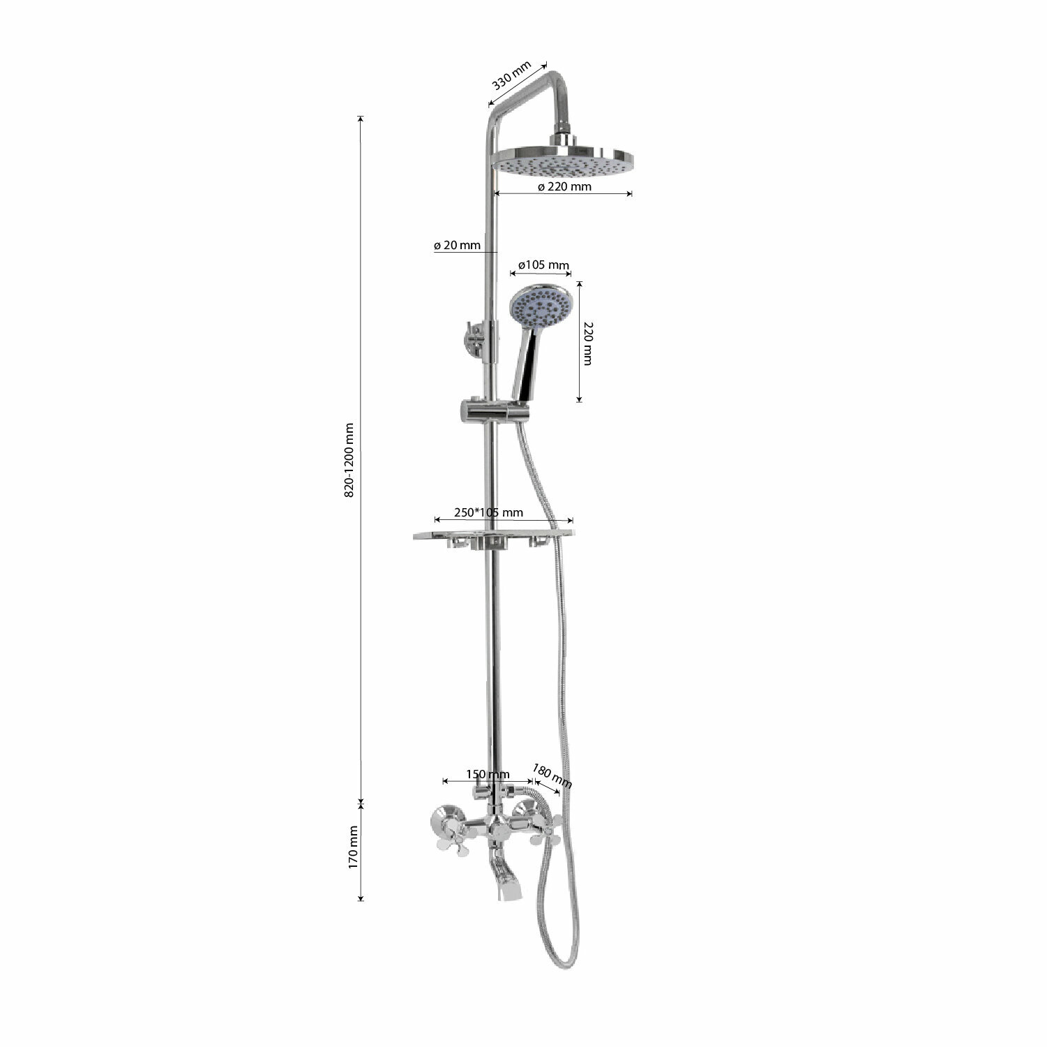 Душевые системы Душевая система BRIMIX-Смеситель+душевая телескопическая стойка 820-1180 мм тропический ДУШ с двумя лейками.Цвет хром.