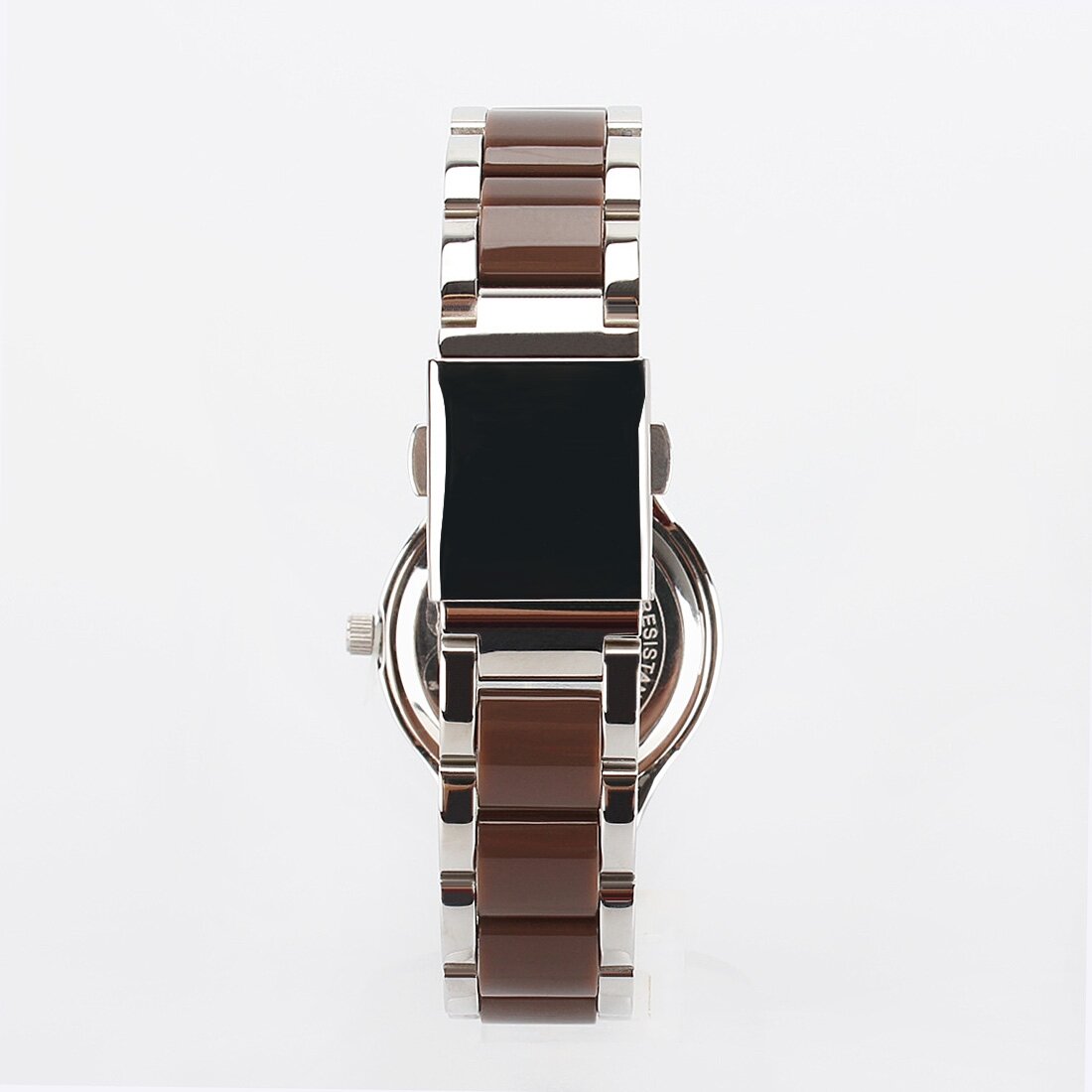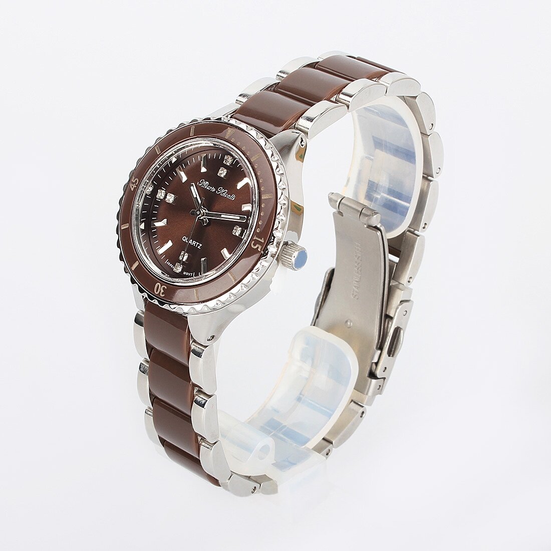 Лучшие цены. Модель наручных часов на браслете с пластиковыми вставками и коричневым циферблатом, внутри которого расположены часовые деления, изящно украшенные стразами. Технические характеристики: кварцевый часовой механизм (Япония), отображает минуты, секунды, часы. Настройка осуществляется с помощью установочного штифта, расположенного справа по корпусу. Часы влагозащищенные. Материалы корпуса: полированная нержавеющая сталь, минеральное стекло. Материал браслета: нержавеющая сталь, пластик. Диаметр: 3 см. Магазины в вашем городе.