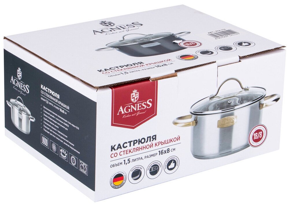Кастрюля agness со стеклянной крышкой, нерж.сталь, 1,5л 16х8,0 см серия craft collection