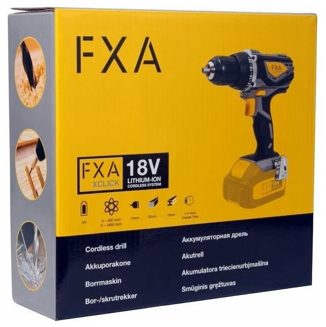 Лучшие цены. Аккумуляторная дрель-шуруповерт 18В финского производителя FXA. Двухскоростная аккумуляторная дрель-шуруповерт FXA XCLICK - это высококачественный и доступный базовый инструмент для ремонта, который должен быть в каждом доме. Дрель-шуруповерт с батарейным питанием легко использовать в любом месте и носить с собой, а провода не мешают работе. • 2 передачи и бесступенчатая регулировка скорости • светодиодная подсветка и зажим для ремня • быстрозажимной патрон 13 мм без ключа для быстрой работы технические. Магазины в вашем городе.