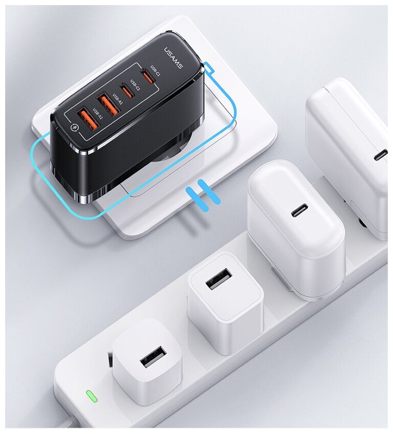 Сетевое зарядное устройство USAMS 100W 2 USB-C + 2 USB-A GaN Fast Charger для ноутбука / планшета / смартфона