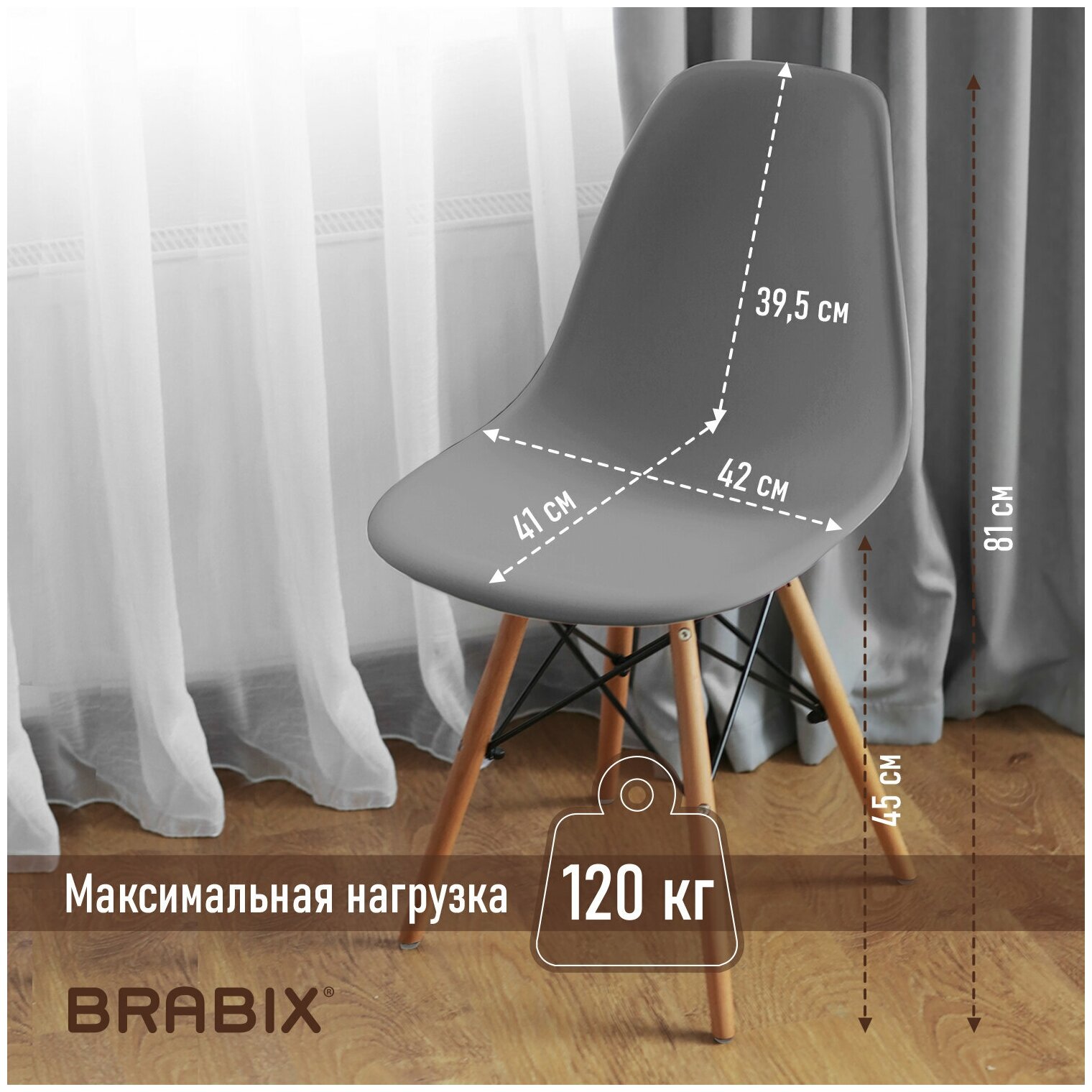 Стул Стулья для кухни комплект 4 шт. Brabix Eames Cf-010 со спинкой мебель для гостинной / офиса / дома пластиковые серые, ножки дерево/металл, 532632