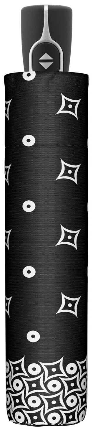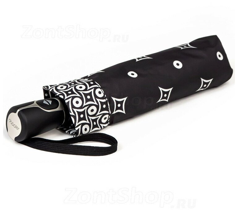 Лучшие цены. Зонт женский Doppler 7441465BW04 (Black-White) 16030 Черный с геометрическим рисункомЭффектный женский зонт от дождя в черном цвете представляет торговая компания Doppler. Строгость орнамента вполне гармонирует с общим стилем модели и подходит практически для любой леди вне зависимости от её возраста и статуса. Отличительной чертой зонтика являются облегченный вес и средние размеры в длину, которые незаменимы для дамской сумочки. Магазины в вашем городе.