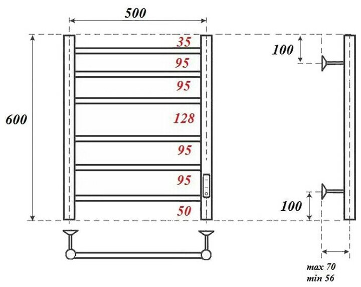Лучшие цены. Характеристики: Высота: 60 см Межосевое расстояние: 50 см Ширина: 53.2 см Количество перекладин: 6 Коллекция: Аврора Тип: электрический Форма: лесенка Направление подключения: по выбору; слева; справа С боковым подключением: нет Глубина: 5.6 см Мощность: 85 Вт Группировка перекладин: да Поворотный: нет Полка в комплекте: нет Материал: углеродистая сталь Подключение: электропровод с вилкой Монтаж: подвесной Цвет: бронза Гарантия на полотенцесушитель: 24 мес Страна происхождения бренда: Россия Теплоноситель. Магазины в вашем городе.