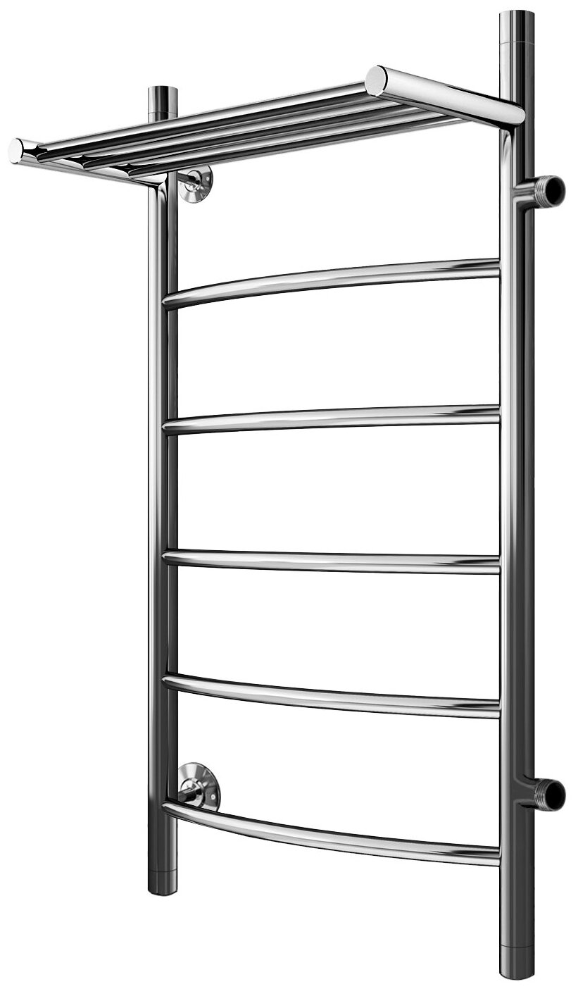 Лучшие цены. Водяной полотенцесушитель Маргроид В4 с полкой 800х500 боковое подключение 50 см цвет хром, тип лесенка сделан из надежной и долговечной пищевой нержавеющей стали марки AISI 304 L и имеет 5 перекладин + 1 верхнюю полку. Изготавливаются они из труб (нержавеющая сталь), наружный диаметр которых составляет 32 мм и 18 мм, толщина стенок - 2 мм. Сварные швы труб сделаны методом аргонной сварки TIG, который соответствует международному стандарту EN 10217-7, и поэтому, едва различимы. Магазины в вашем городе.