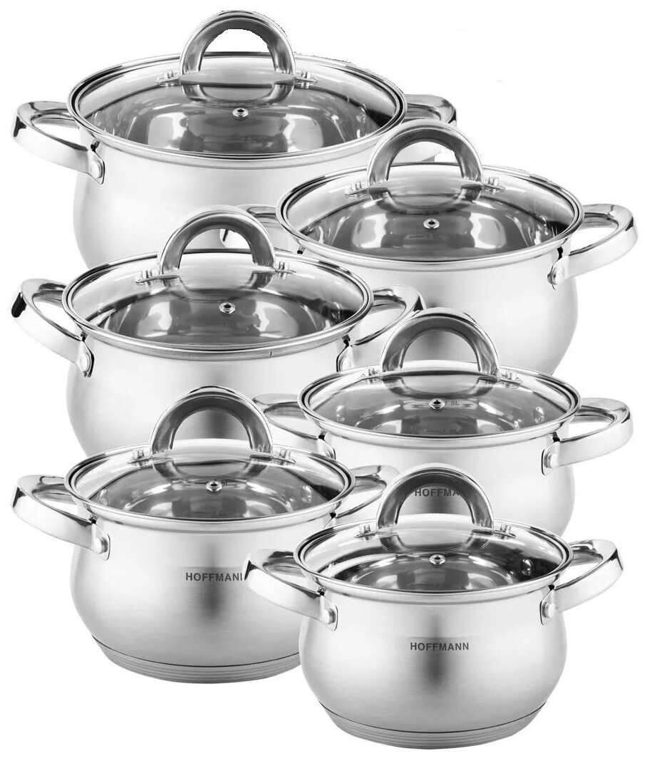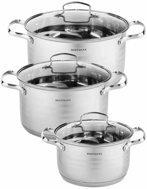 Лучшие цены. Набор кастрюль с крышкой Hoffmann НМ 5214. Набор кастрюль от торговой марки "Hoffmann" изготовлен из высококачественной нержавеющей стали. Зеркальная полировка в сочетании с матовой придает посуде безупречный внешний вид. Благодаря энергосберегающему капсульному дну, тепло равномерно распределяется по стенкам посуды. Для приготовления пищи в такой посуде требуется минимальное количество масла, тем самым уменьшается риск потери витаминов и минералов в процессе термообработки продуктов. Магазины в вашем городе.