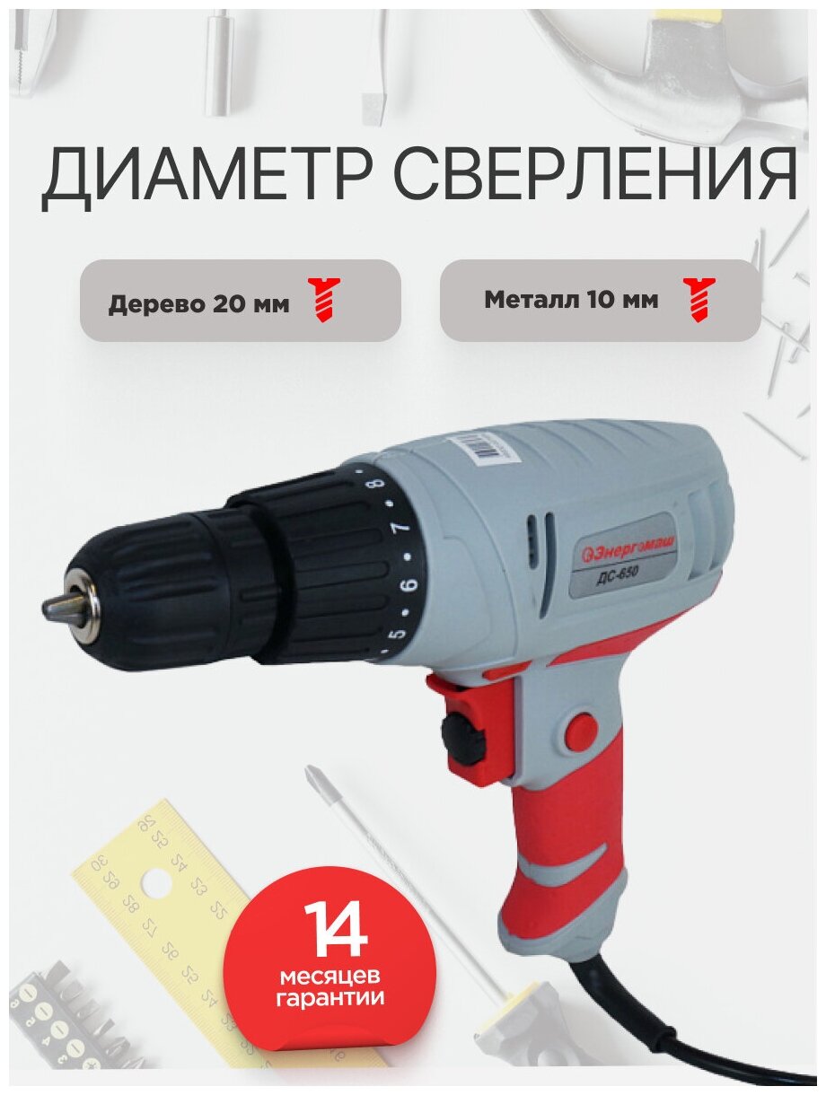 Лучшие цены. Электрическая сетевая дрель шуруповерт Энергомаш ДС-650 — надежный, качественный электроинструмент для дома, дачи и ремонта. Работа от сети позволяет не зависит от заряда батареи, а мощность 650 Вт является достаточной для бытовых нужд. Патрон быстрозажимной, удобный для быстрой смены оснастки. Обратите внимание: в комплекте отсутствует кейс для инструментов, шуруповерт поставляется в картонной коробке. Магазины в вашем городе.
