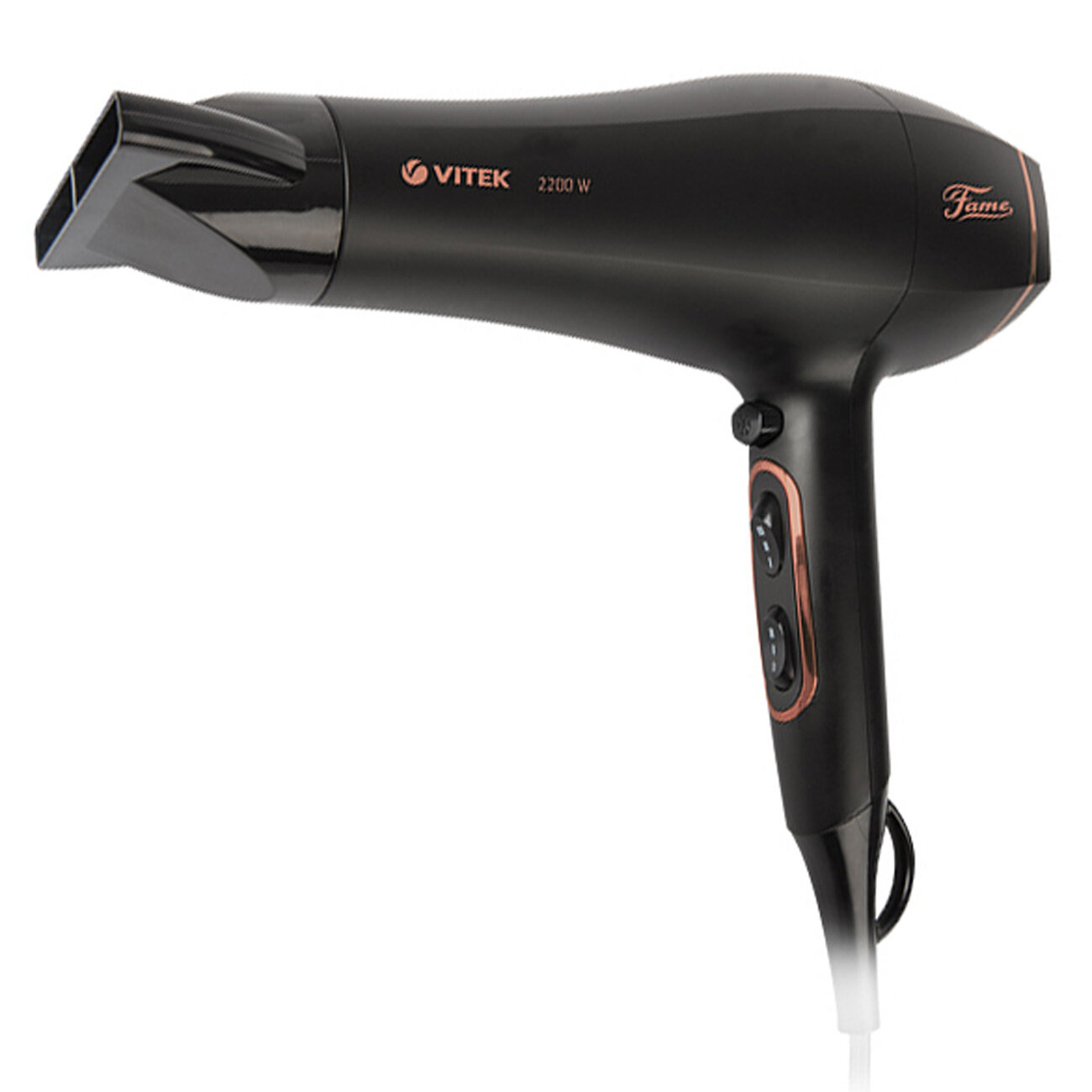 Лучшие цены. После укладки феном Vitek VT-8220 с функцией ионизации высушенные волосы будут меньше пушиться и станут более гладкими и блестящими. Мощный мотор (2200 Вт) и насадка-концентратор позволят вам быстро сделать аккуратную причёску, а с помощью обдува холодным воздухом – закрепить желаемую форму. Длины шнура 2 метра достаточно для свободы движений во время работы устройства. Благодаря рукоятке эргономичной формы держать прибор будет удобно. Магазины в вашем городе.