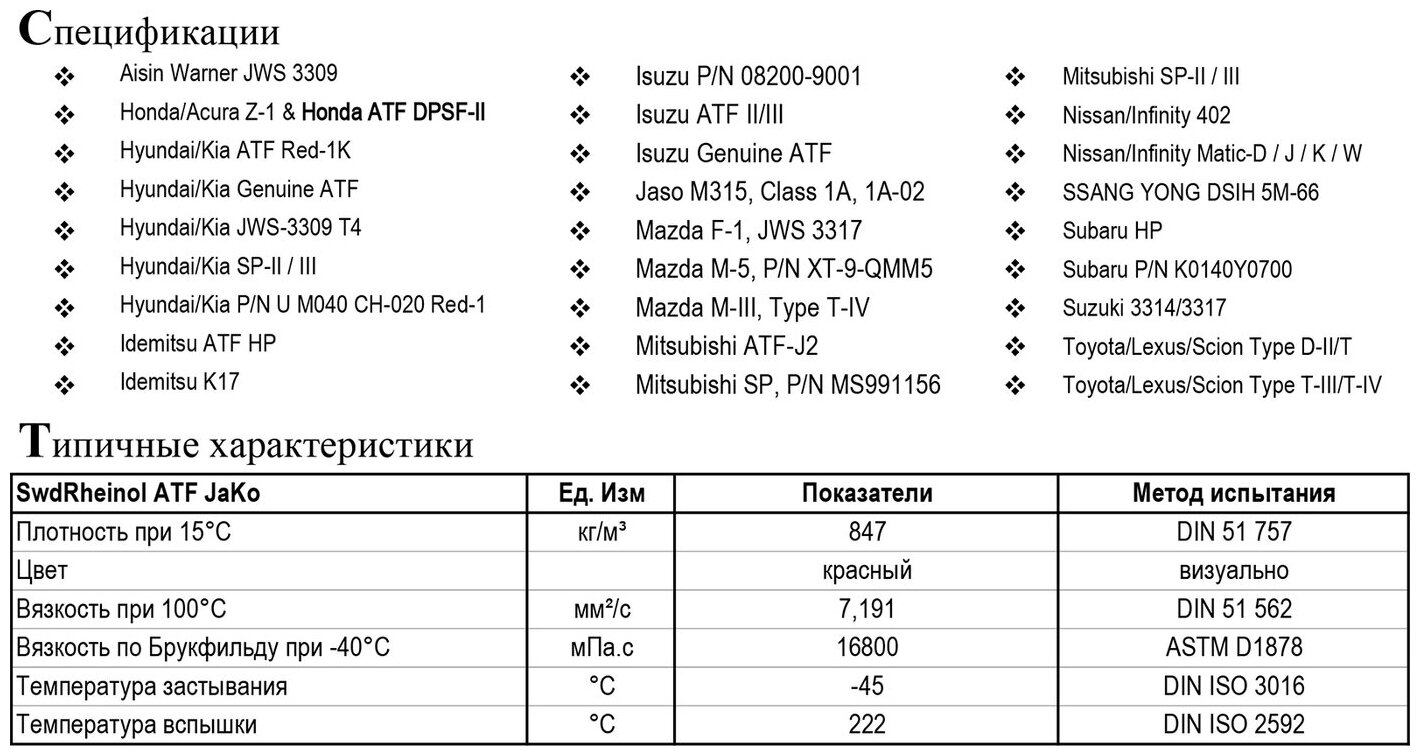 Лучшие цены. SwdRheinol ATF JaKo - специальная жидкость (ATF) для автоматических коробок передач. Производится из базовых масел на основе технологии синтеза с применением специальной комбинации активных присадок. Разработана в сотрудничестве с одним из крупнейших азиатских производителей автоматических коробок передач, согласно всех современных требований и спецификаций. Требования, предъявляемые к японским и корейским трансмиссиям существенно отличается от европейских, особенно в том, что касается стабильности к. Магазины в вашем городе.