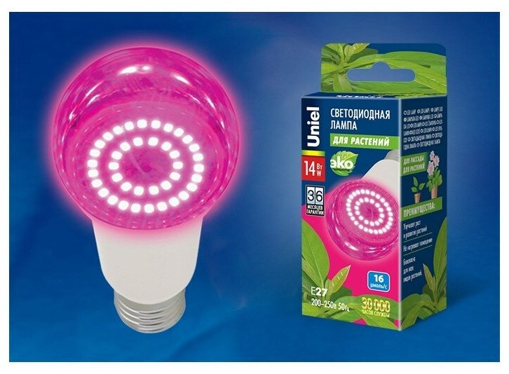 Лучшие цены. Лампа светодиодная для растений LED-A60-14W/SPSB/E27/CL PLP30WH из серии «Для растений A» от производителя Uniel (Китай). Цвет товара серый. Используемые материалы: металл. С учетом технических характеристик мощности хватит для освещения 5 м2. Цоколь E27. Вид ламп: светодиодная. Изделие выполнено в форме «шар». Мощность одной лампы составляет 14 Вт. Напряжение 220-240 Вольт. Уровень защищенности от влаги и пыли IP20. Заявленный производителем срок работы 30000 часов. Расширенная гарантия на товар 2,5 года. Магазины в вашем городе.