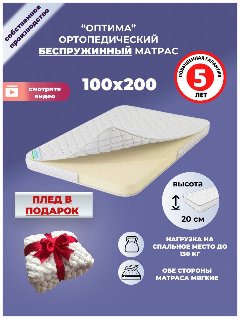 Матрас 100х200 см, ОптиМа, Беспружинный, высота 13 см, Съемный чехол, Плед в подарок