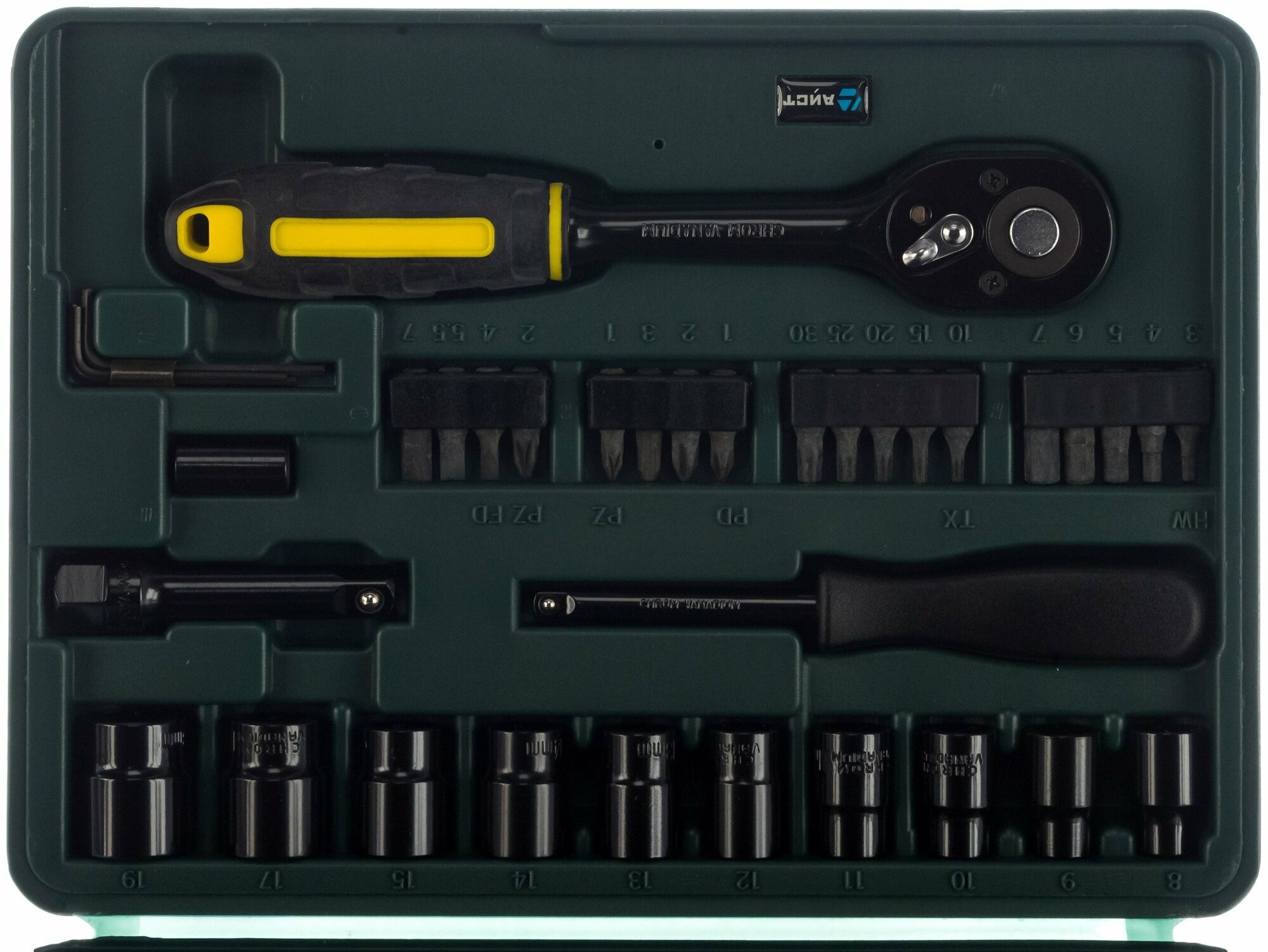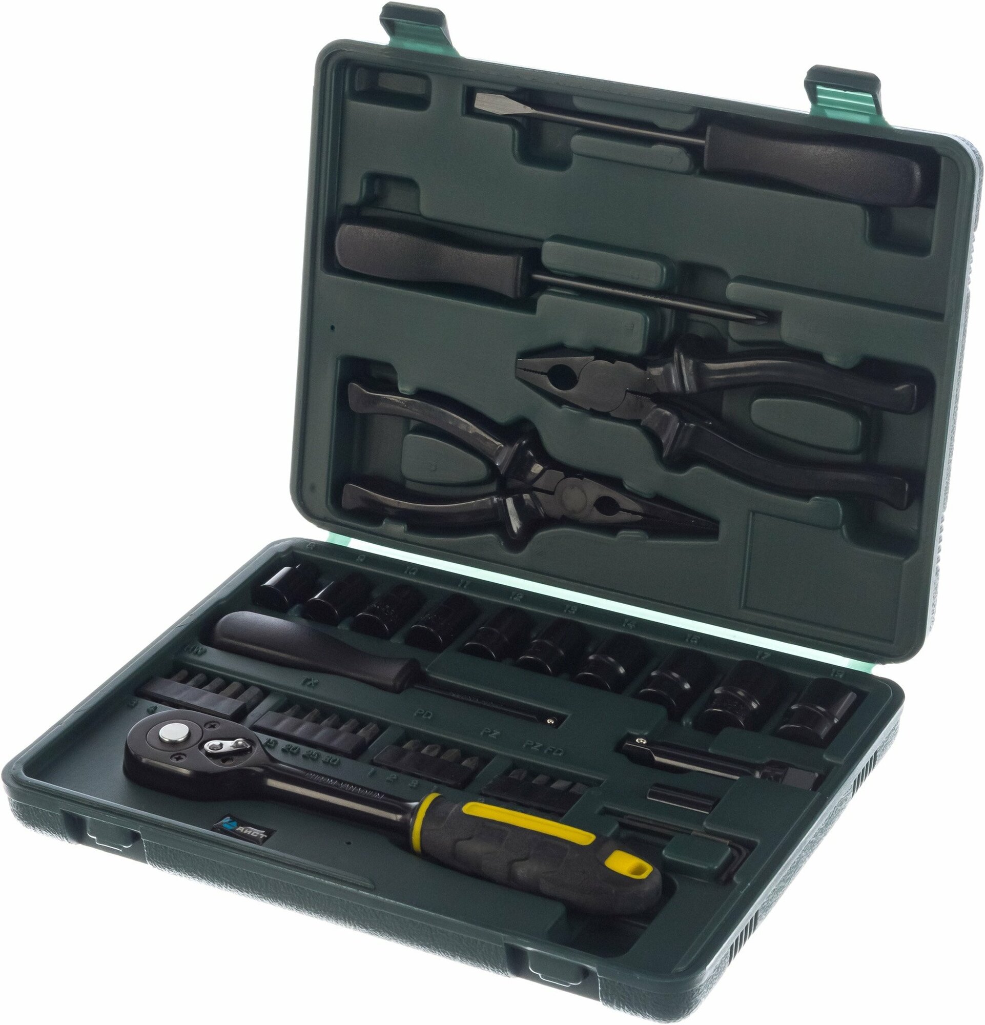 Лучшие цены. Компактный набор инструментов 1/4" и 3/8" 41 предмет с 6-гранными головками в кейсе. Набор слесарно-монтажного инструмента 1/4" и 3/8" дюйма будет незаменимым помощником для выполнения разнообразных слесарных, монтажных и ремонтных работ. Наличие шарнирно-губцевого инструмента, отверток и бит делают данный компактный набор незаменимым помощником дома, гараже, автомобиле, мастерской и т. д. Сталь: Chrome-Vanadium (Cr-V) Хромованадиевая сталь. Материал бит: S2 легированная сталь. Магазины в вашем городе.