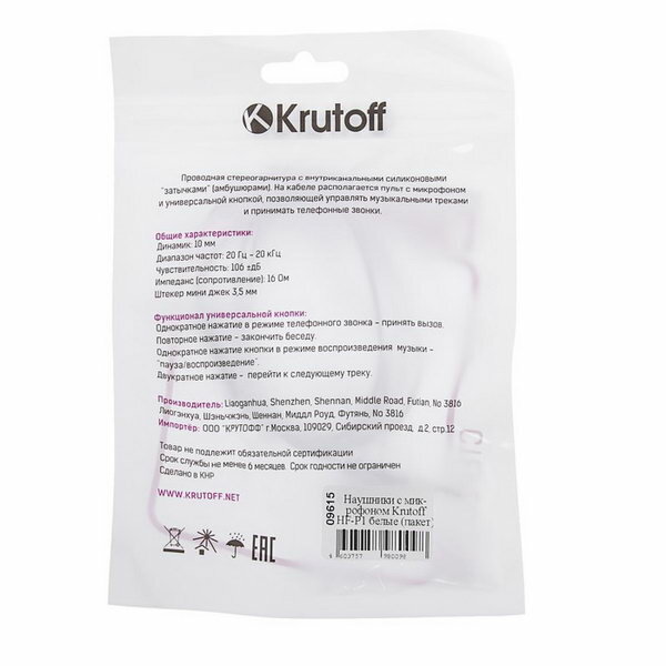 Наушники Krutoff HF-P1, вакуумные, микрофон, 106 дБ, 16 Ом, 3.5 мм, 1 м, белые