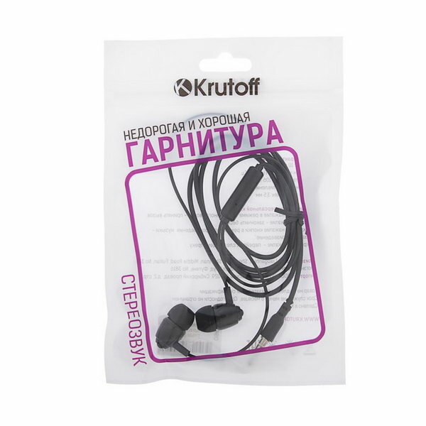 Наушники Krutoff HF-P1, вакуумные, микрофон, 106 дБ, 16 Ом, 3.5 мм, 1 м, черные