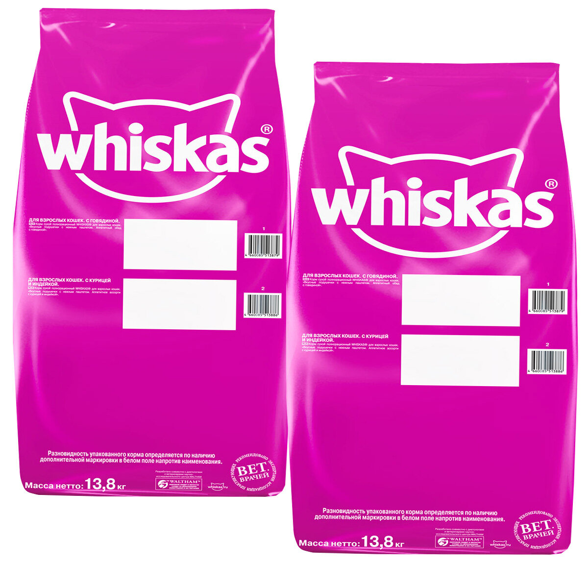 Корм для кошек WHISKAS аппетитное ассорти для взрослых кошек с курицей и индейкой с нежным паштетом (13,8 + 13,8 кг)