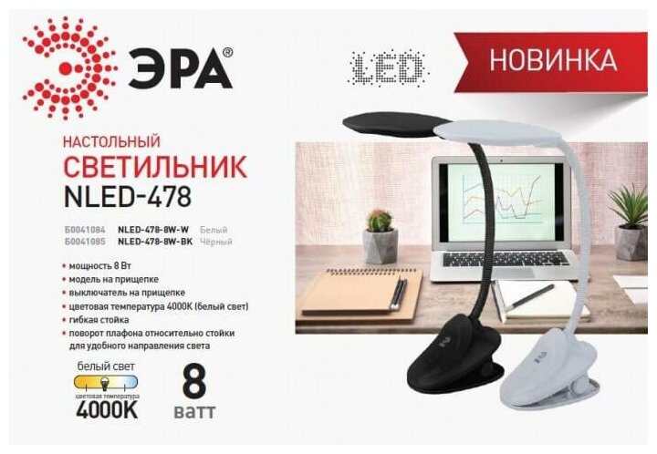 Лучшие цены. Настольная лампа NLED-478-8W-BK из серии «NLED-478» от производителя ЭРА (Россия). Дизайн-стиль современный. Отлично подойдет для такого типа помещений, как офис. Цвет товара черный. Используемые материалы: пластик. Дизайн и форма плафона округлый. Цоколь LED. Вид ламп: светодиодная. Мощность одной лампы составляет 8 Вт. Напряжение 220-240 Вольт. Уровень защищенности от влаги и пыли IP20. Расширенная гарантия на товар 2 года. Длина 300 мм. Ширина 95 мм. Высота 400 мм. Вес товара 0.552 кг. Магазины в вашем городе.