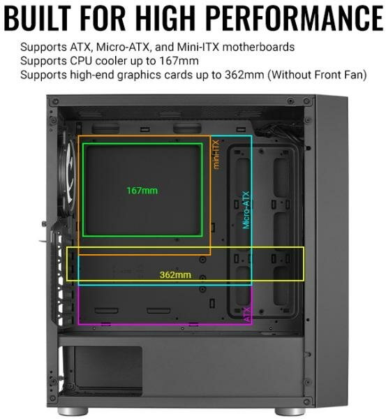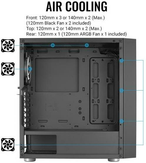 Лучшие цены. Назначение: Корпус; Типоразмер: ATX Midi Tower; Форм-фактор: ATX; Мощность блока питания: Без БП; Материал: сталь, закалённое стекло; Цветовое оформление корпуса: чёрный; Расположение блока питания: В нижней части; Выходы на передней панели: 2 x USB 3.0; Окно: нет; Наличие дверцы: нет; Места под дополнительные вентиляторы: Передняя панель: 120 мм x 3 or 140 мм x 2 (2 х 120 мм чёрный вентилятор), Верхняя панель: 120 мм x 2 or 140 мм x 2 (Макс.), Задняя панель: 120 мм x 1 (Вентиляторы 120 мм ARGB включены x 1). Магазины в вашем городе.