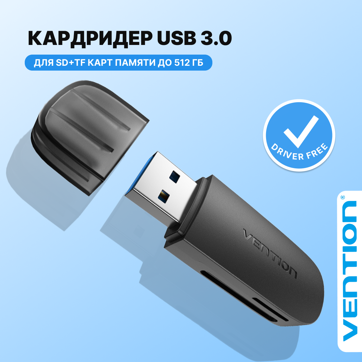 Картридер Vention USB 3.0 (SD+TF) Черный