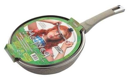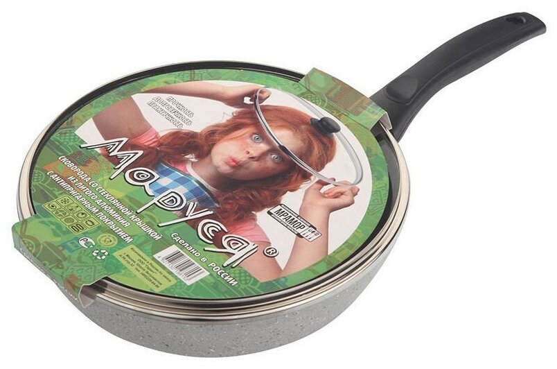 Лучшие цены. Сковорода со стеклянной крышкой, покрытие "Мрамор" (серый) Marusya Сковорода со стеклянной крышкой из литого алюминия с антипригарным мраморным покрытием Внутреннее и внешнее упрочнённое трёхслойное антипригарное покрытие «Greblon» немецкой компании Weilburger coatings. За счет керамического армирования покрытие отличается повышенными показателями по износостойкости и увеличенной устойчивостью в случае воздействия острых предметов. Магазины в вашем городе.
