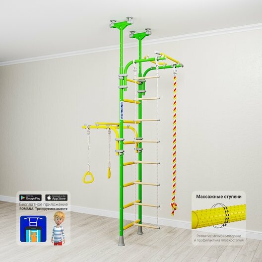 Лучшие цены. Вы получаете два комплекса в одном и по оптимальной цене — действительно, настоящий трансформер! Шведская стенка ROMANA Transformer надежно крепится враспор в любом месте дома или квартиры. В этом детском уголке предусмотрены перемещающиеся турник и укосы. Они могут крепиться на любой высоте и в различных положениях, все оптимизируется под юного владельца. Ступени лестницы покрыты эко-пластикатом, исключается проскальзывание рук и ног. Ширина лестницы — 49 см. Магазины в вашем городе.