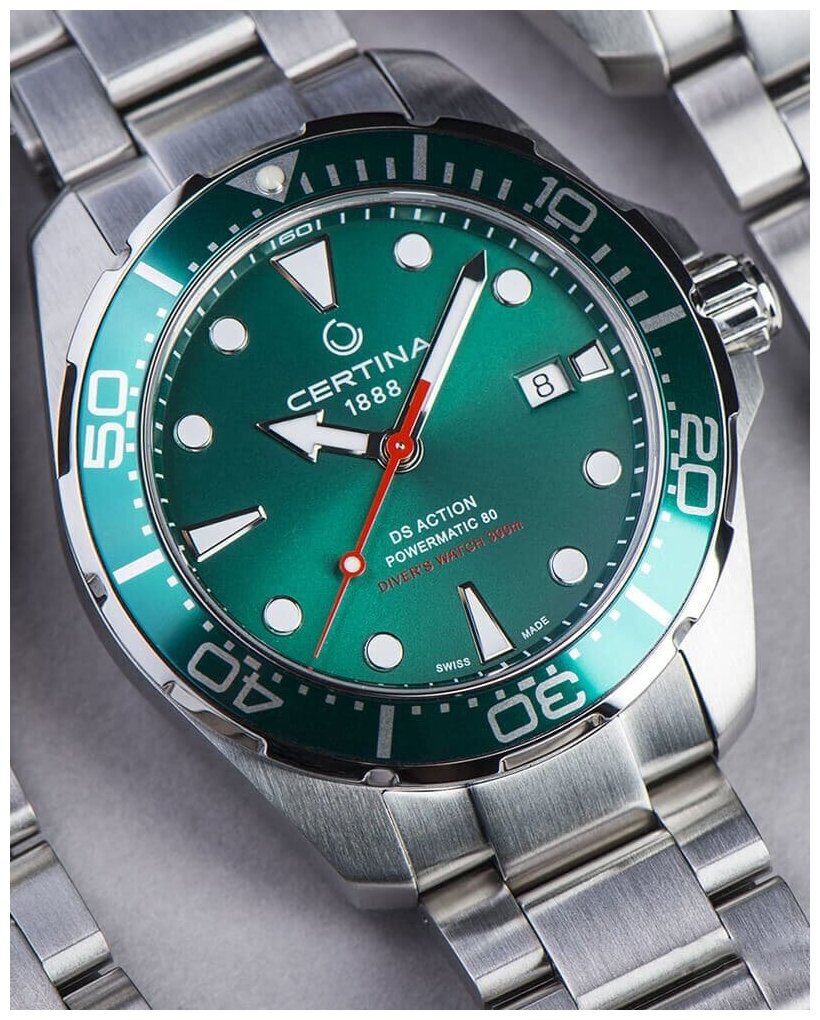 Лучшие цены. Швейцарские мужские механические часы Certina DS Action Diver Powermatic 80 C032.407.11.091.00 из коллекции DS Action отражают непревзойдённый стиль с дайверским характером. Модель имеет яркий акцент в виде зелёного циферблата и красной секундной стрелки. Крупная индикация времени позволяет считывать показания с циферблата в любой ситуации. Автоматический швейцарский калибр ETA {= templateTooltip " powermatic80" " Powermatic 80"} с резервом хода на 80 часов. Магазины в вашем городе.
