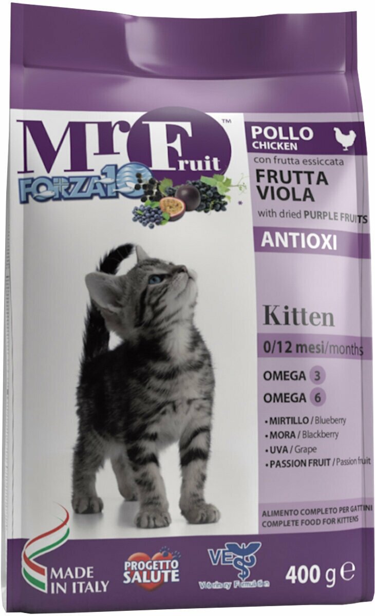 Лучшие цены. Сухой корм для котят Forza10 Mr. Fruit Kitten с экстрактами фиолетовых фруктов — это сбалансированный, повседневный рацион для Вашего маленького питомца. Для гармоничного развития Вашему котёнку ежедневно необходимо достаточное количество питательных веществ, а также витаминов, минералов и основных незаменимых жирных кислот. Особенности Формула корма Mr. Fruit Kitten была разработана ветеринарными врачами компании SANYpet для обеспечения всем тем, что необходимо организму на стадии развития и роста. Магазины в вашем городе.