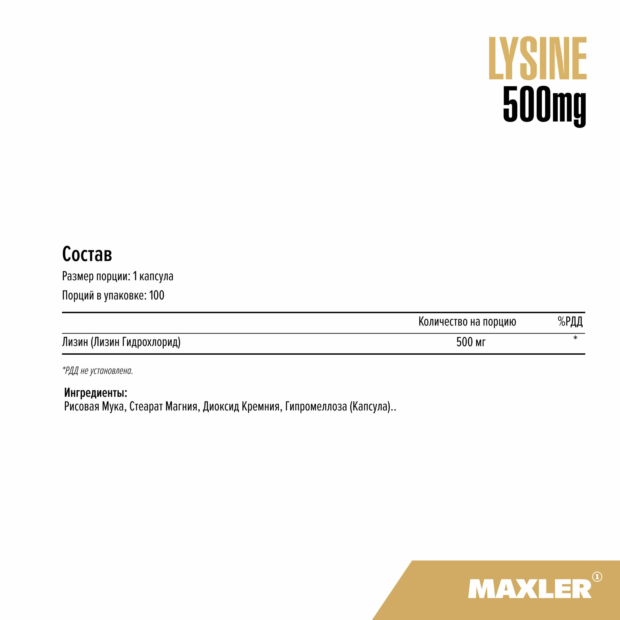 Maxler, L-Lysine 500 mg, 100 капсул