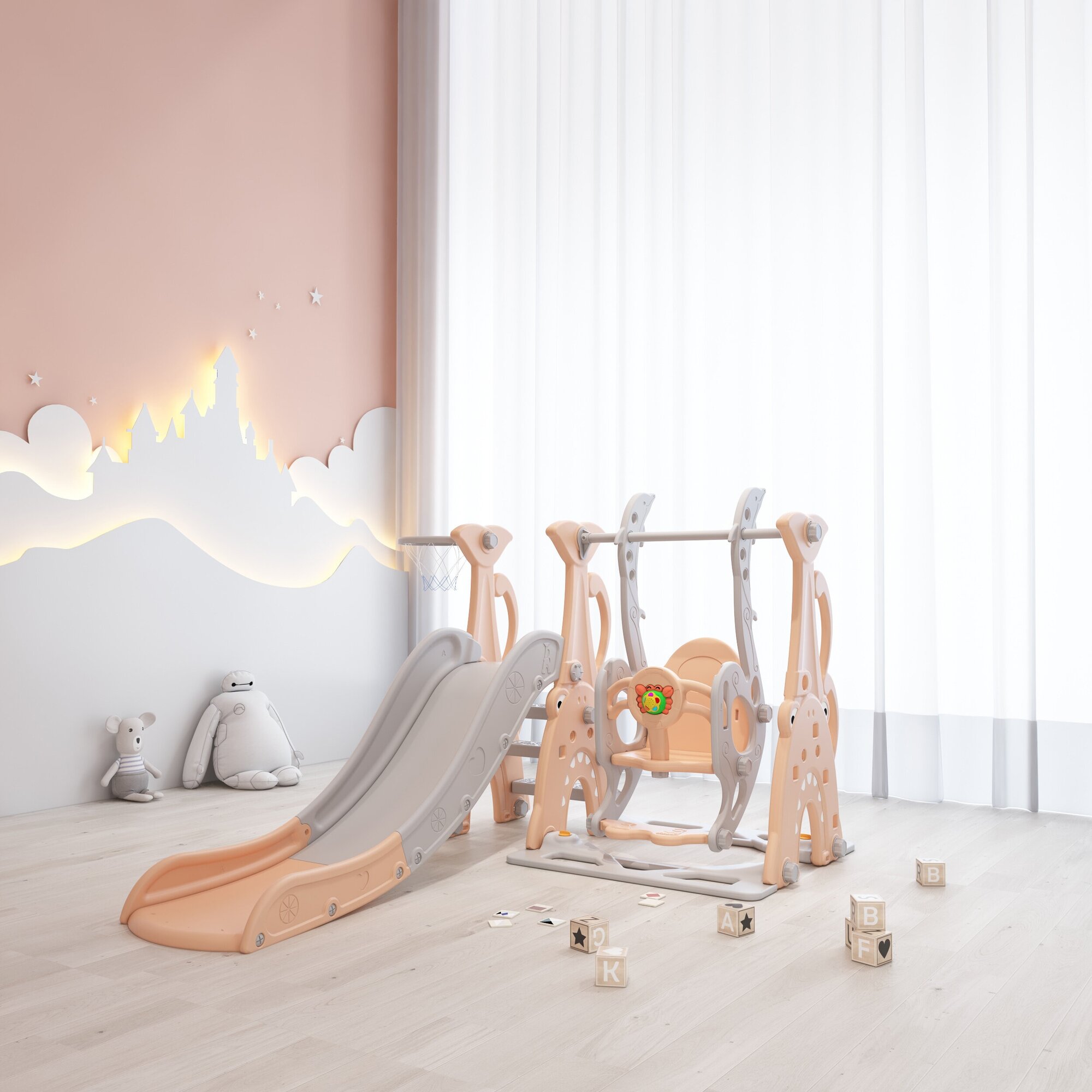 | Функции | баскетбольное кольцо, качели, модульная конструкция |