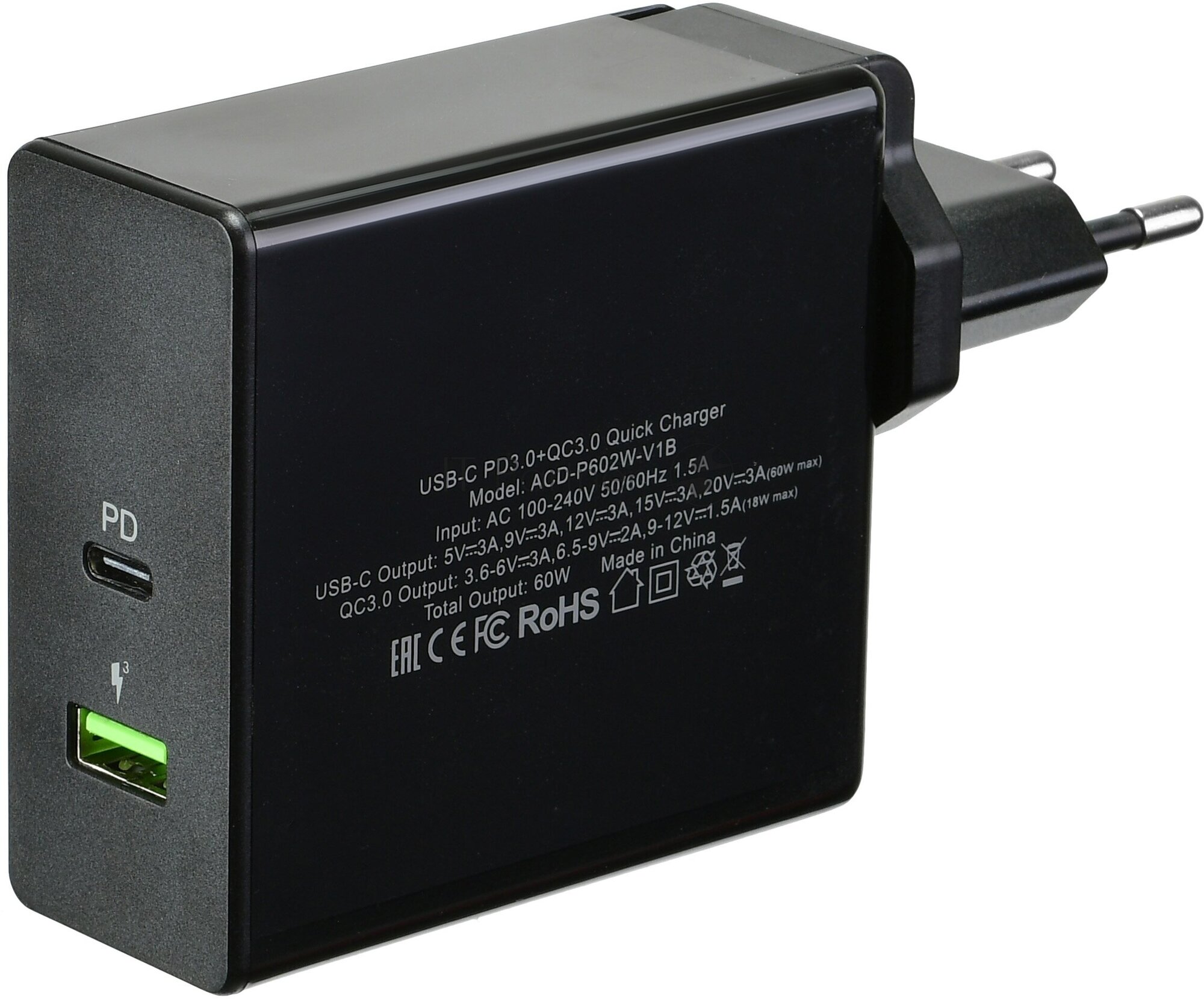 Зарядное устройство сетевое ACD ACD-P602W-V1B 60Вт, 2xUSB 1PD+1QC, 3.6~20В/3А, RTL